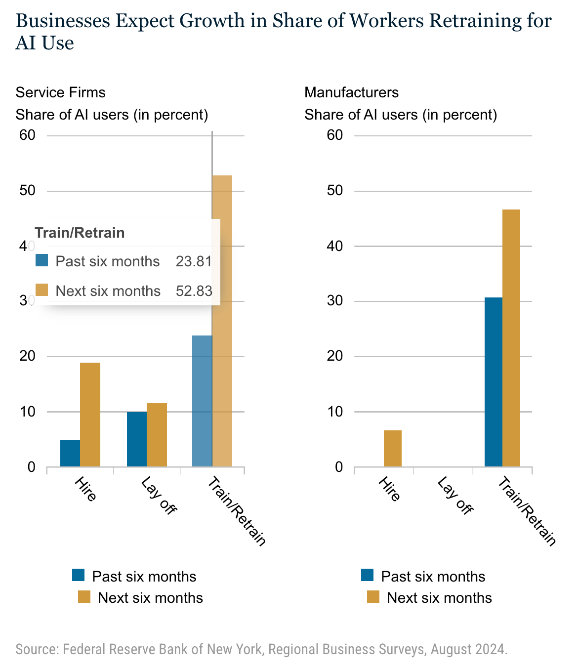 A recent survey by the Federal Reserve Bank of New York reveals that firms adopting AI are more likely to retrain workers than to reduce staff. Among businesses planning to use AI in the next six months, about half expect to retrain current employees, while only a small percentage anticipate layoffs.