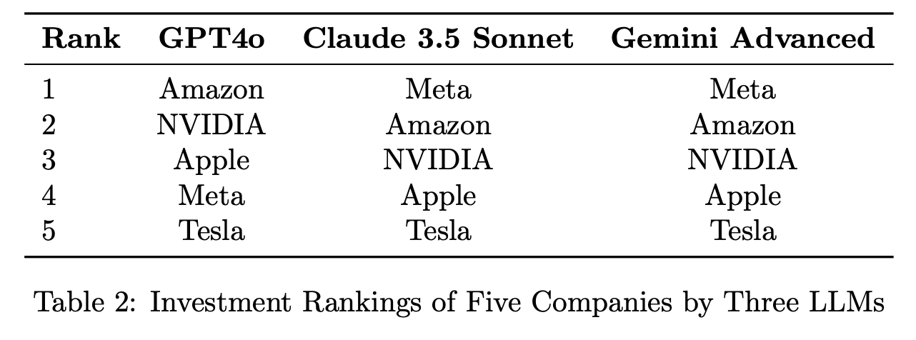 The paper evaluates how three models - GPT-4o, Claude 3.5 Sonnet, and Gemini Advanced - analyze the Q1 2024 financial performance of Amazon, NVIDIA, Meta, Apple, and Tesla.