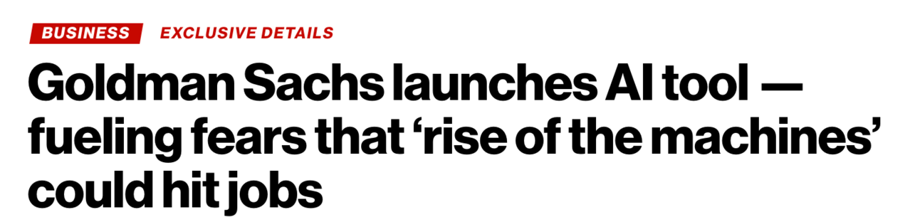 This rapid adoption is being treated as a potential job killer, like this New York Post headline on Goldman releasing AI firmwide.