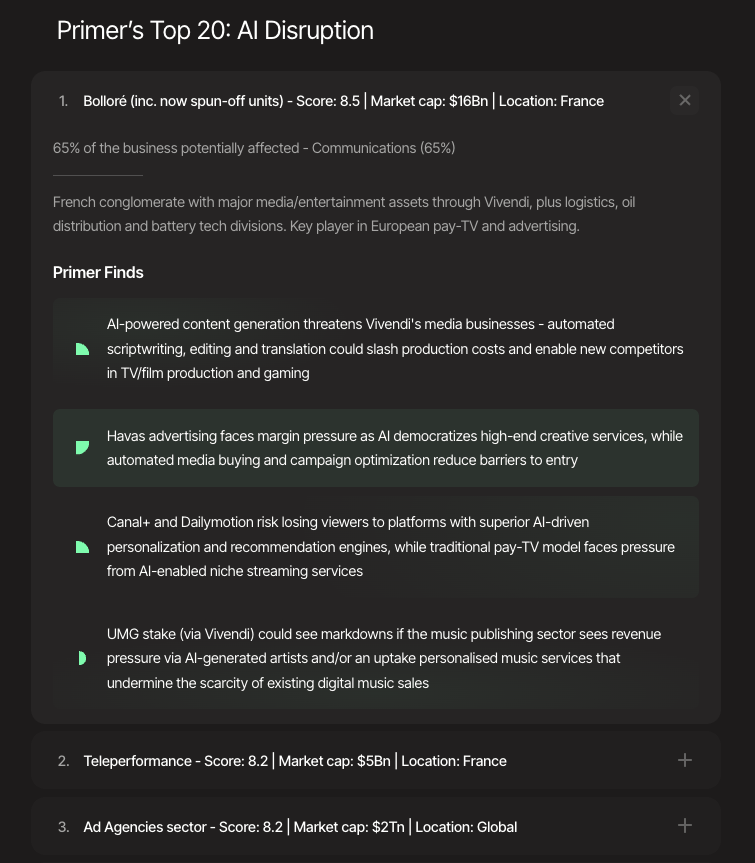 Primer, a U.K.-based AI for equity research platform, recently used this ability to create an AI Disruption Report, which ranks 2,000 companies by their vulnerability to AI-driven market shifts.