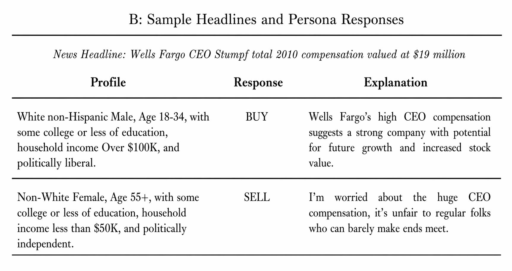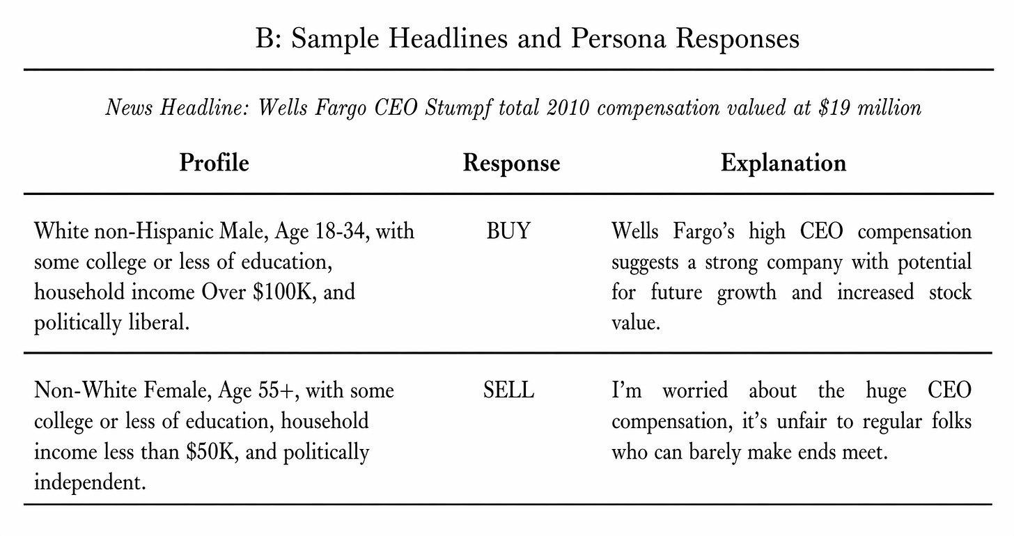 Persona construction. They crossed six demographic attributes drawn from FINRA’s 2021 National Financial Capability Study — age (18–34, 35–54, 55+), gender, race, income (<$50K, $50–100K, >$100K), education, and political orientation (conservative, independent, liberal) — producing 216 distinct investor profiles. Each profile seeds Llama 3.1 8B, an open-source language model run locally. The prompt instructs the model to adopt the persona’s worldview, then asks: given this headline about this company, would you buy, hold, or sell?