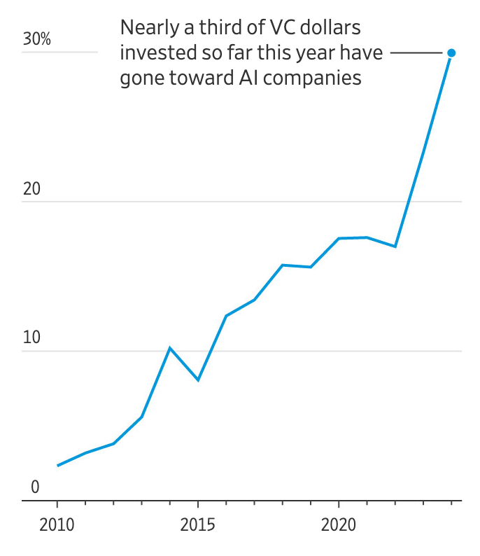 Investments in VC AI startups have climbed to $64 billion so far this year — on track to approach a peak set during a broader investing surge in 2021. The total share of VC investments in AI is the highest on record. (WSJ)