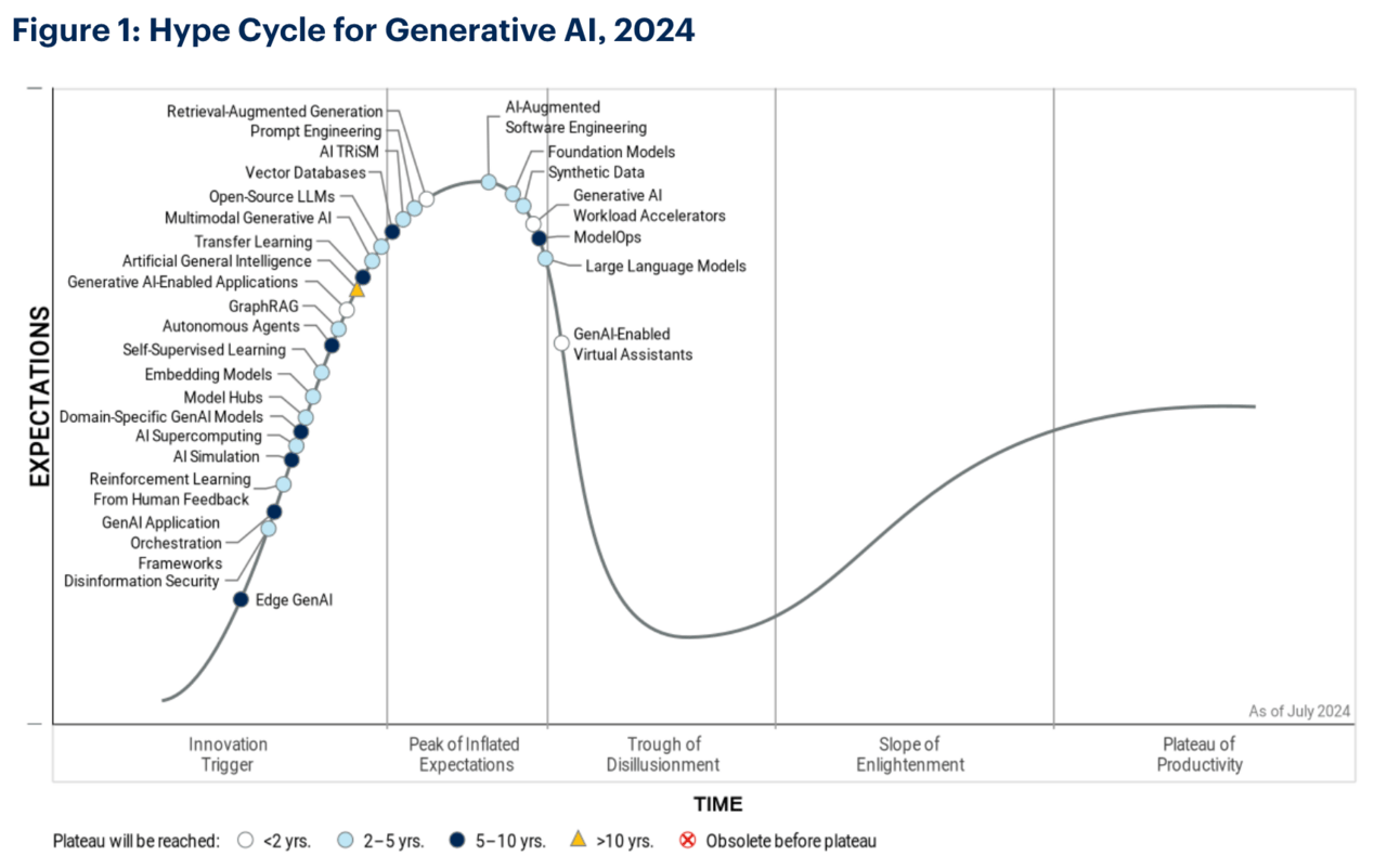 While the GenAI market is entering a "Trough of Disillusionment," analysts suggest that real benefits may emerge as the technology matures over the next few years. (Gartner)