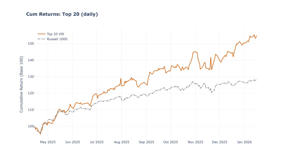 Every night from April 2025 through January 2026, they queried a leading U.S. frontier AI model via its web interface with live search enabled, with no pre-selected news or filings fed to the model. The model autonomously searched the web, synthesized what it found, and returned a score (−5 to +5) for each Russell 1000 stock.