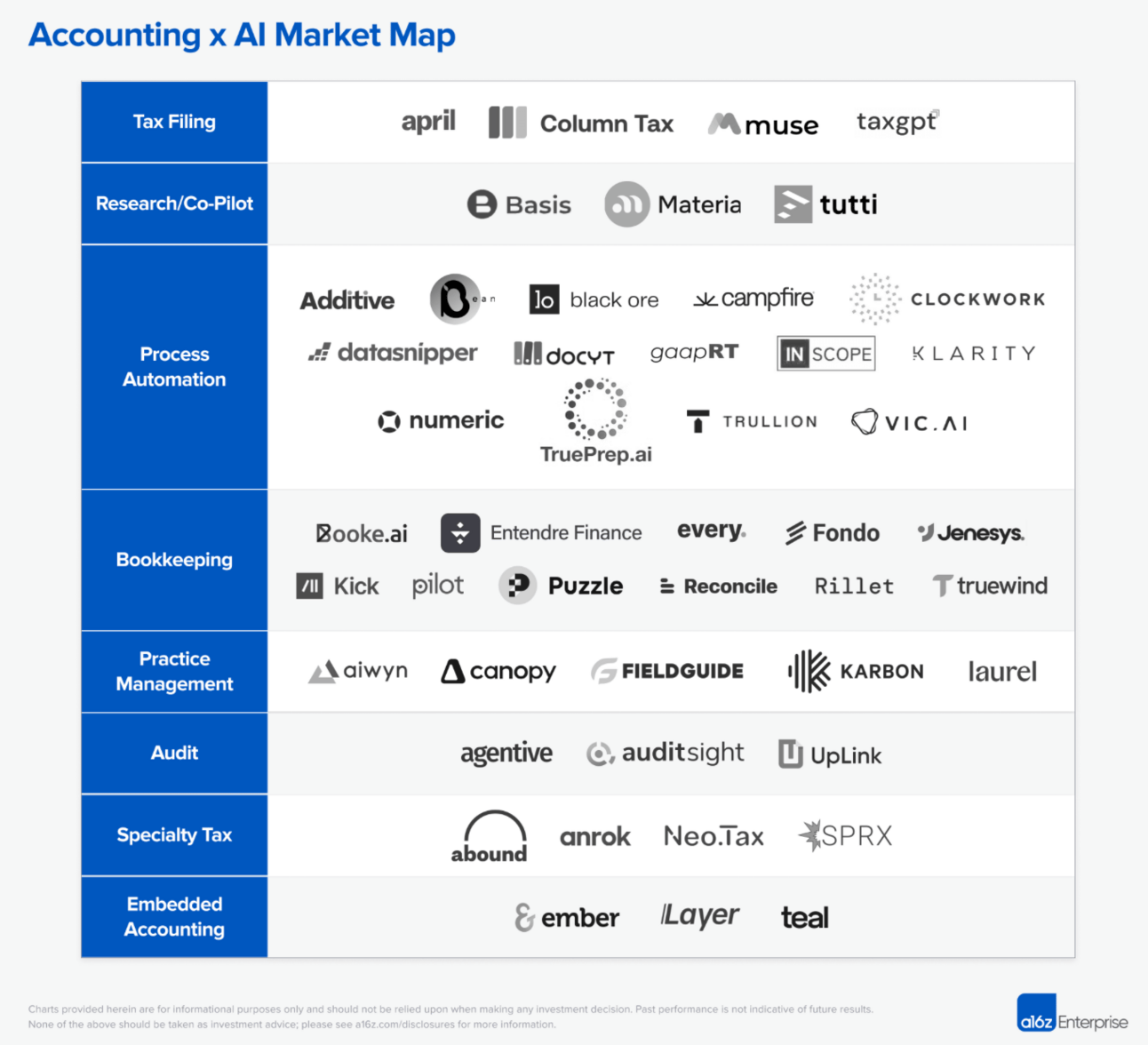 Andreessen Horowitz put together a table of the many firms looking to leverage AI for auditing.
