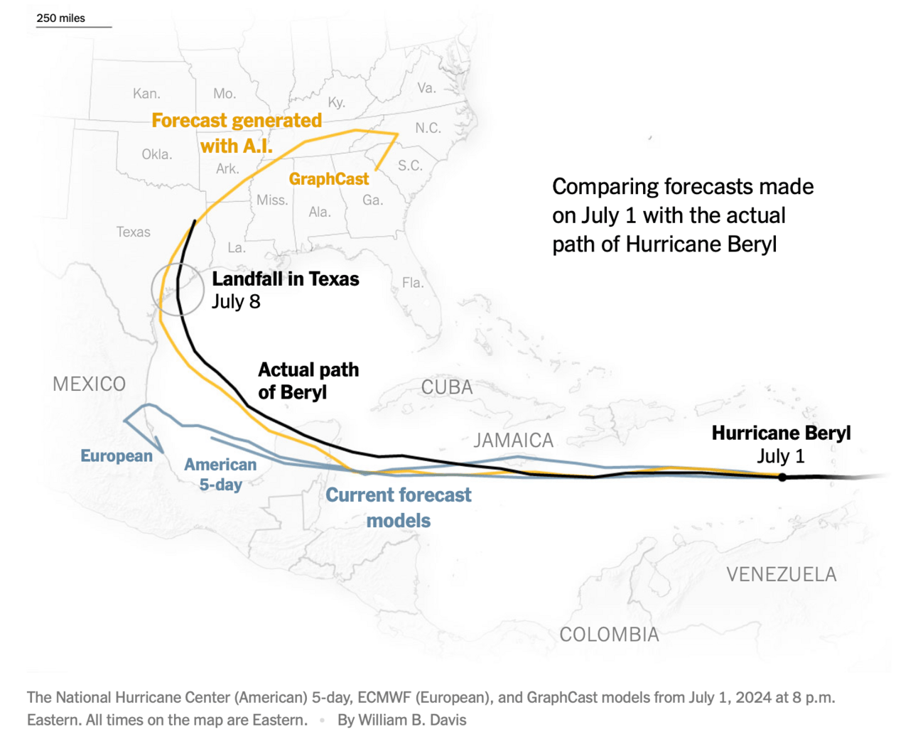 Predicting global weather patterns with new speed and precision, AI is doing in minutes and seconds what once took hours, according to the New York Times.