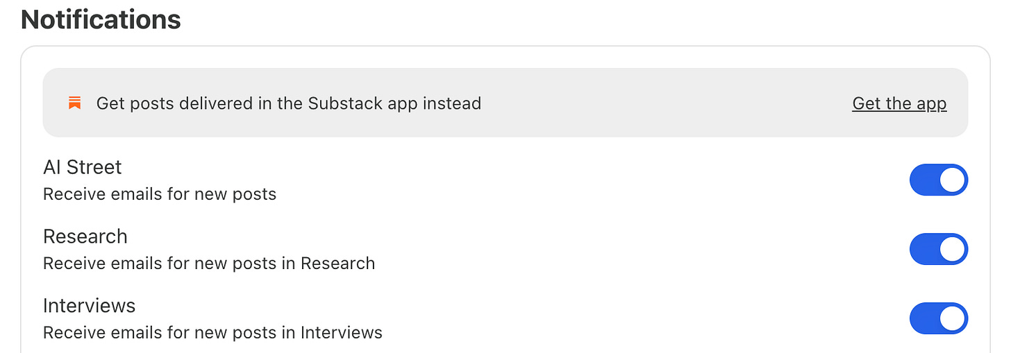 AI Street is introducing a few focused sections so you can choose what appears in your inbox. Research and interviews have already been part of the newsletter, but you can now subscribe to those formats individually.