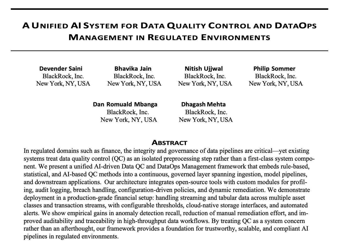 Paper: A Unified AI System for Data Quality Control and DataOps Management in Regulated Environments